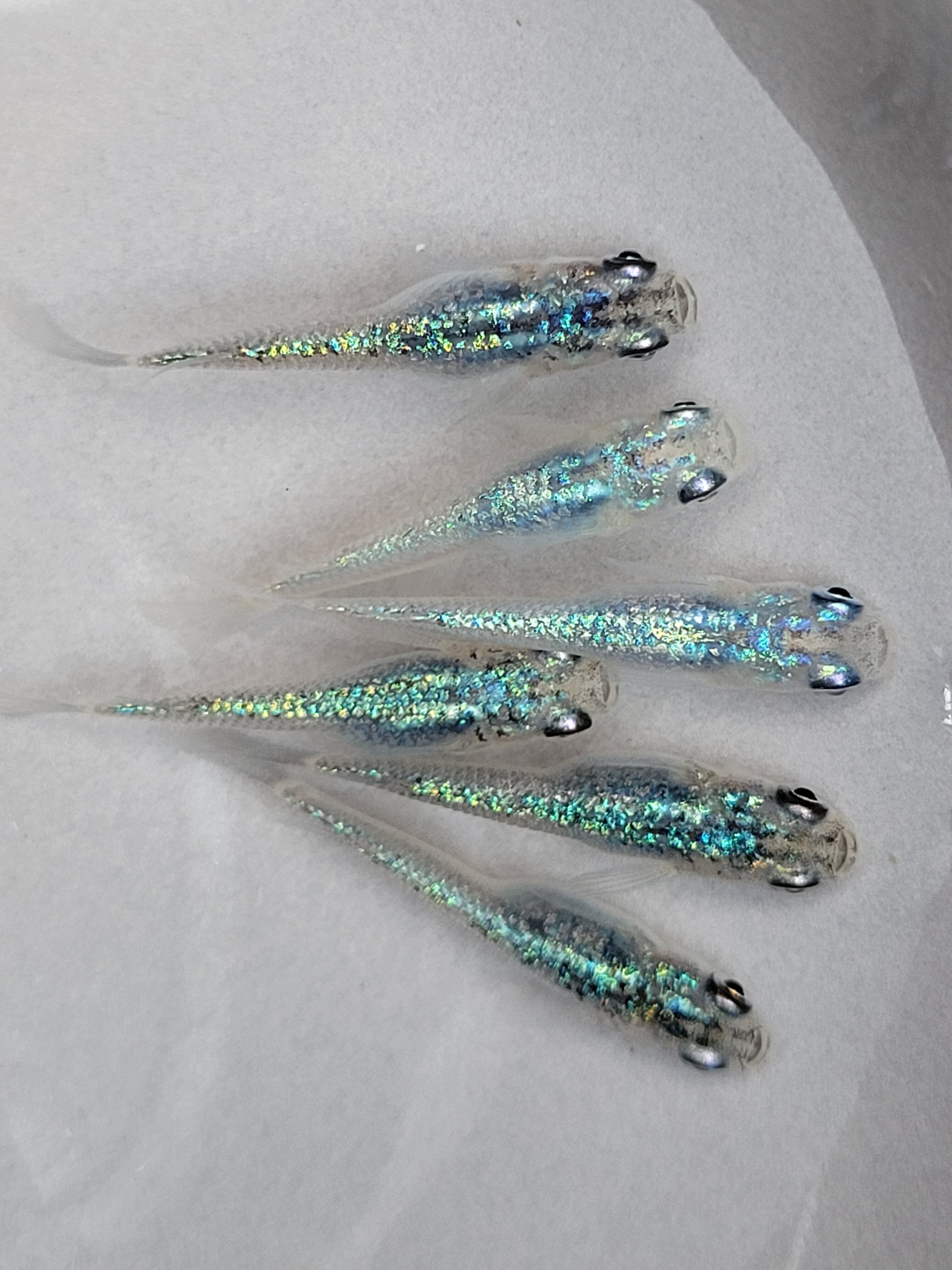てんてんで掛け合わせ中の個体でサファイアの青色と琥珀ラメ背びれ無しから出る青ラメの累代個体からなるめだかです。